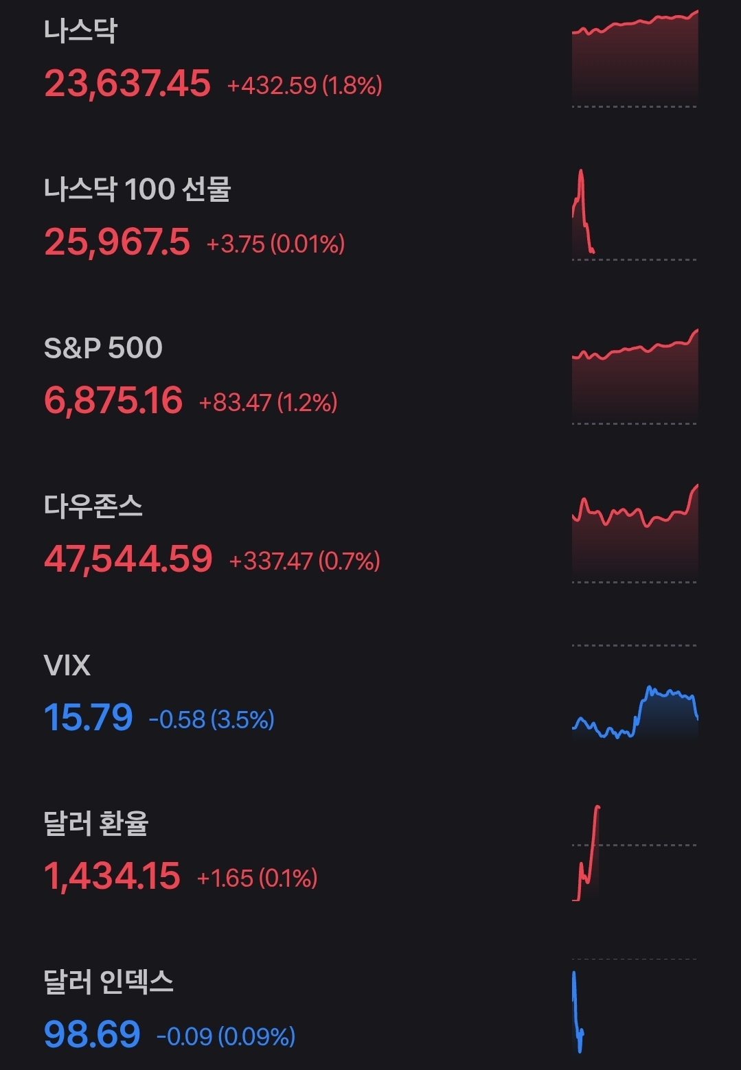 → 미·중 정상회담을 앞두고 협상 타결 기대감이 커지면서 뉴욕증시 주요 지수가 일제히 상승했습니다. 특히 기술주가 강하게 반등하며 나스닥이 1.9% 오르는 등 시장의 위험자산 선호가 회복된 모습입니다. 연준의 금리 인하 기대와 더불어 AI 반도체주 중심의 강세가 지수 전반을 끌어올린 것으로 보입니다. 인플레이션 완화 조짐과 기업 실적 개선 흐름이 맞물리면서 투자심리가 빠르게 개선되고 있네요.