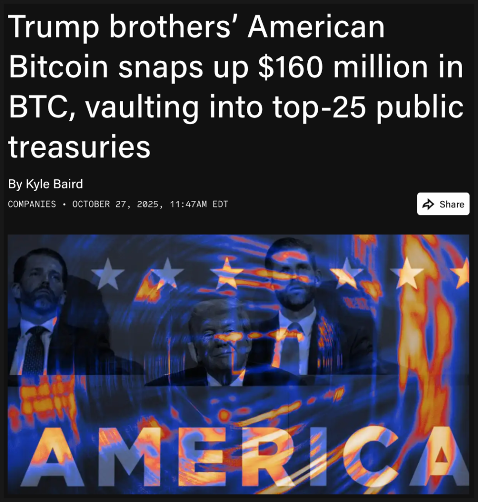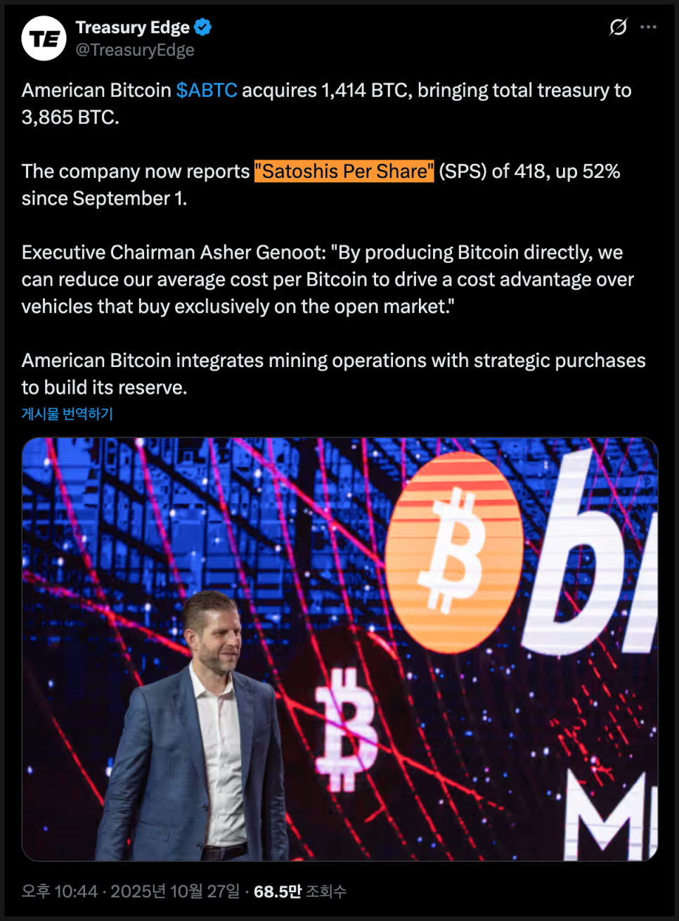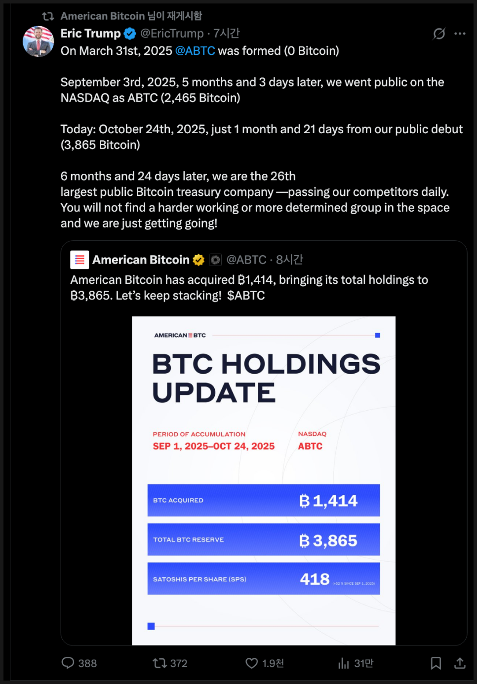 또 다른 주목할 만한 움직임은 아메리칸 비트코인(American Bitcoin)입니다. 이 회사는 미국 트럼프 대통령의 아들인 에릭 트럼프(Eric Trump)와 도널드 트럼프 주니어(Donald Trump Jr.)가 공동 창립한 비트코인 채굴 및 적립형 기업인데요. 최근 비트코인 1,414개를 약 1억 6,000만 달러 규모로 추가 매수하면서 전체 보유량을 3,865개로 늘렸습니다.