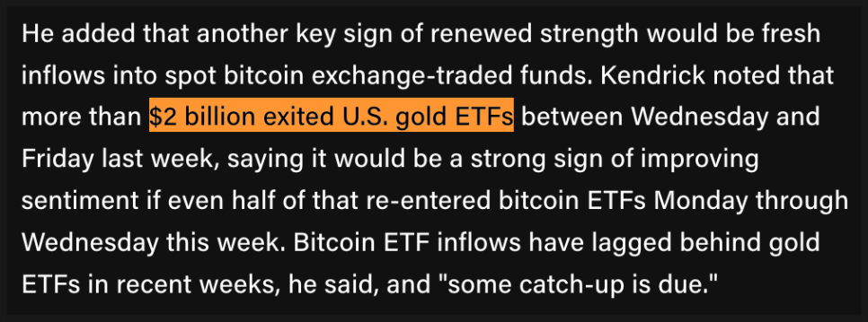 ETF(상장지수펀드) 자금 흐름도 중요한 신호입니다. 지난주 후반 미국 금 ETF에서 약 20억 달러가 유출됐는데요. 켄드릭은 이 자금 중 절반만이라도 이번 주 초 비트코인 ETF로 유입된다면 투자심리가 본격적으로 회복되는 것으로 해석할 수 있다고 강조했습니다. ETF는 대형 투자자들이 합법적이고 제도권 안에서 자금을 투입하는 수단이기 때문에, 이는 단순한 투자 이상의 의미를 갖습니다.