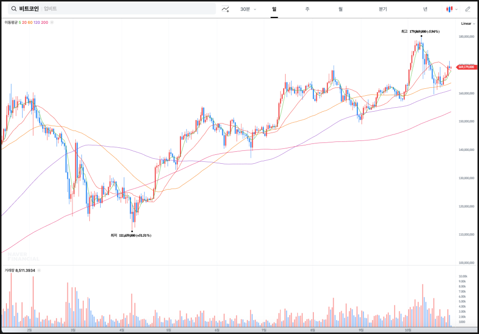 이 구간에서 가장 중요한 건 단기 상승세가 중장기 추세로 이어질 수 있는지 여부입니다. 단기선이 장기선 위에서 안정적으로 안착하고 가격이 다시 고점 부근을 돌파한다면, 1억 8,000만 원대 재도전 가능성도 충분히 열려 있는 상황이죠. 반대로 단기선이 꺾이고 거래량이 줄어든다면 조정 폭이 깊어질 수 있어 주의할 필요도 있습니다.