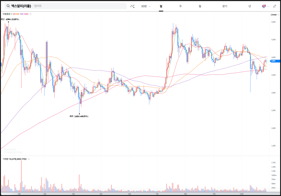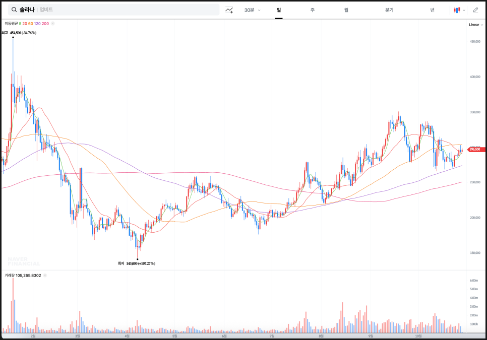 8월과 9월에는 단기 이동평균선이 장기선 위에서 안정적으로 자리하며 상승세가 강하게 나타났지만, 이후 고점 부근에서 매물이 쌓이면서 조정이 진행됐습니다. 현재 가격은 29만 원대에서 단기선과 중기선이 수렴하는 구간에 머물러 있으며, 아래쪽으로는 200일선이 지지선 역할을 하고 있습니다.