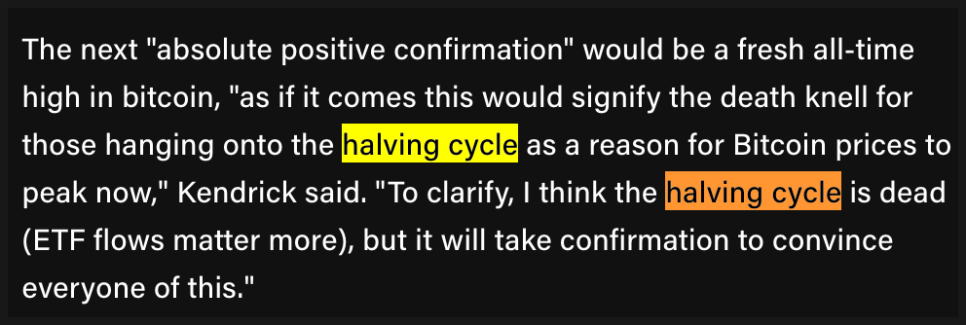 또한 켄드릭은 전통적으로 비트코인 가격 주기를 설명해왔던 ‘반감기 사이클’의 시대가 저물고 있다고도 언급했습니다. 반감기란 비트코인 공급량이 절반으로 줄어드는 이벤트로, 과거에는 이 시점을 기준으로 가격 상승 사이클이 반복된다는 이론이 시장을 지배해왔습니다. 하지만 켄드릭은 “이제는 ETF 자금 흐름과 거시 유동성이 가격을 결정하는 핵심 변수로 떠올랐다”며 “이번 주 사상 최고가가 갱신된다면 반감기 사이클 시대는 사실상 끝났다고 봐야 한다”고 분석했습니다.