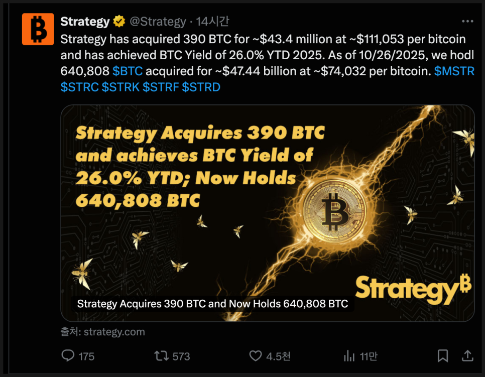 스트래티지는 10월 20일부터 26일까지 약 3,900만 달러(한화 약 590억 원)를 들여 비트코인 390개를 추가로 매수했습니다. 개당 평균 매입가는 11만 1,117달러였고요. 이로써 스트래터지가 보유한 비트코인 총량은 640,808개에 달하게 됐습니다. 현재 시세로 약 740억 달러 규모입니다.