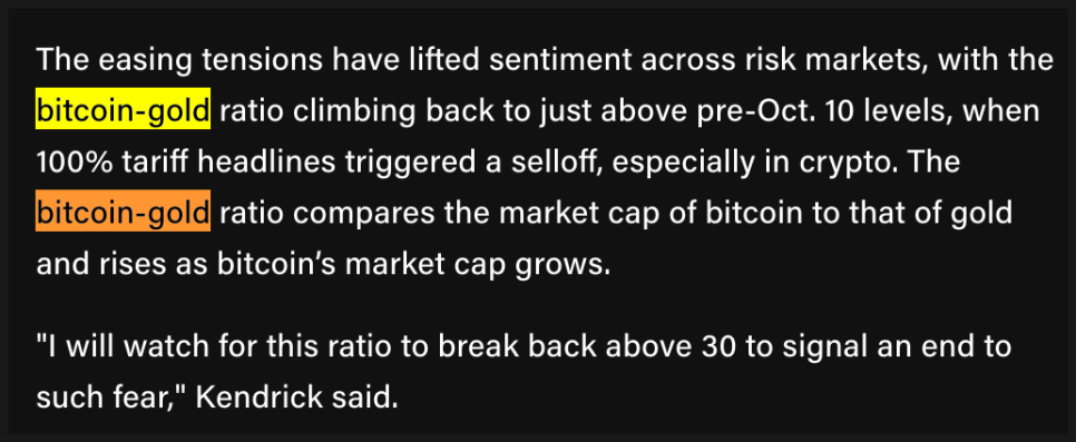 이 완화된 분위기는 금융시장 전반에 긍정적으로 작용하고 있습니다. 켄드릭이 주목한 지표는 바로 ‘비트코인-금 비율(bitcoin-gold ratio)’인데요. 이 지표는 비트코인의 시가총액을 금의 시가총액과 비교한 값으로, 비트코인 시총이 커질수록 이 비율이 올라갑니다. 10월 10일 관세 관련 뉴스로 급락했던 이 비율이 현재는 회복세를 보이며 당시 수준을 다시 넘어섰습니다. 켄드릭은 “30 이상을 돌파하는 순간이 오면 시장의 공포가 완전히 사라졌다는 신호가 될 것”이라고 말했습니다.