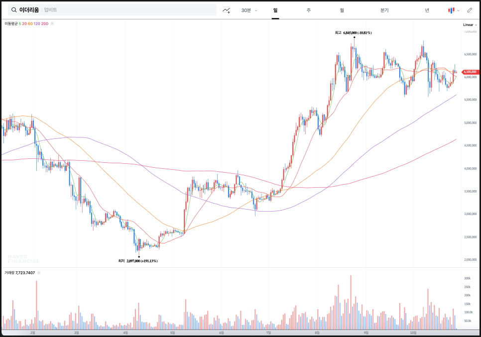 특히 7월 이후에는 가격이 가파르게 오르며 680만 원 부근에서 고점을 기록했습니다. 이후 조정 국면이 이어졌지만 120일선 아래로 밀리지 않고 있어 중장기 추세가 무너지지는 않은 모습입니다. 단기선과 중기선이 반복적으로 수렴하고 다시 벌어지는 패턴이 나타나고 있다는 점도, 상승세가 한 번에 꺾이지 않고 ‘숨 고르기’를 거치며 이어지고 있음을 보여줍니다.