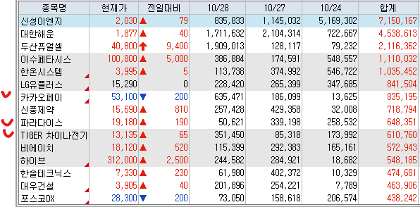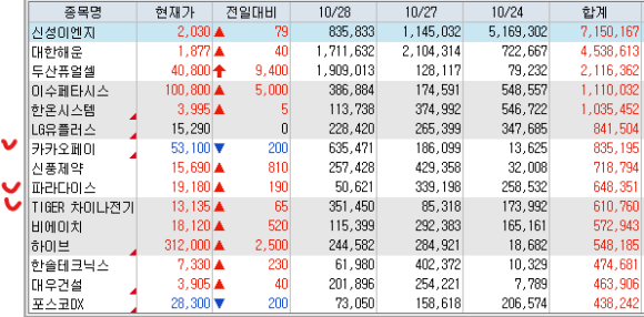 매수 : 맥쿼리인프라 제이알글로벌리츠 골프존 카카오페이 아모레퍼시픽 파라다이스 Tiger차이나전기차 Tiger차이나휴머로이드로봇 한국콜마 덕산네오룩스 STX엔진
