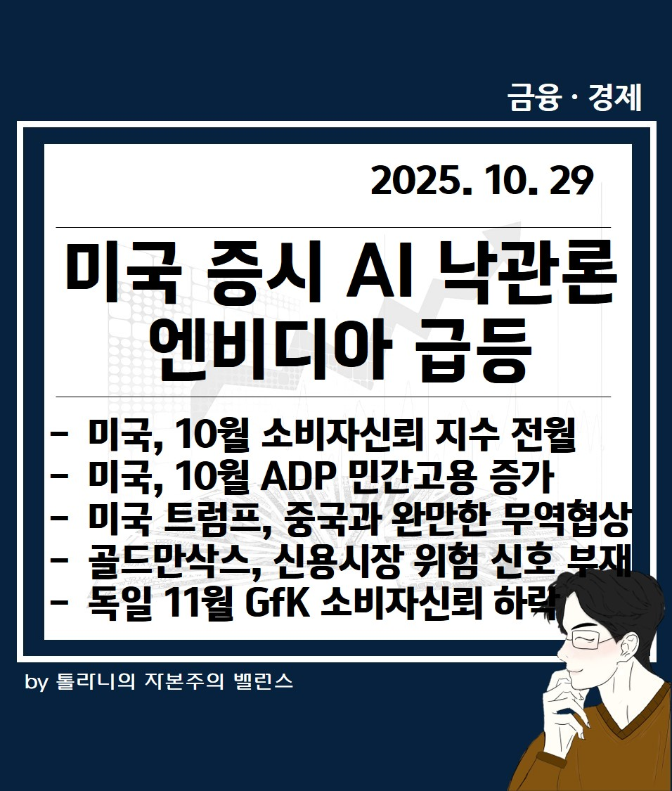 이에 '미국 증시 AI 낙관론 엔비디아 급등, 10월 소비자신뢰지수, ADP 민간 고용 증가 등 주요 국가 경제·금융 동향' 관련하여 알아보도록 하겠습니다.