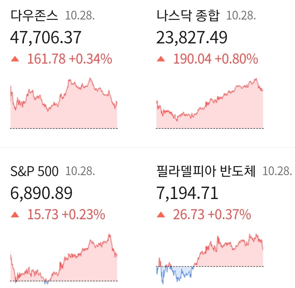 다우지수는 전일 대비 +0.34% 오른 47.706.37에 거래를 마쳤으며, 대형주 중심의 S&P500 지수는 전장 대비 +0.23% 상승한 6,890.89에 장을 마감하였습니다. 기술주 중심의 나스닥 지수는 전 거래일 대비 +0.80% 오른 23,827.49에 거래를 마쳤습니다.
