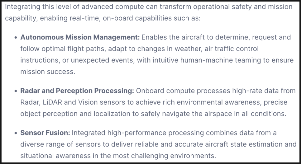 레이더 및 인식 처리(Radar and Perception Processing): 다수의 센서 데이터를 실시간으로 결합해 사물 인식, 거리 계산, 비행 환경 파악을 정밀하게 수행합니다.