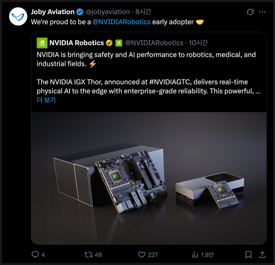 그 이유는 세계 최대 반도체 기업인 엔비디아(NVIDIA)가 자사의 차세대 AI 플랫폼 ‘IGX 소어(IGX Thor)’의 유일한 항공 분야 파트너로 조비를 선택했다는 소식이 전해졌기 때문입니다. 단순한 AI 협업을 넘어, 전 세계 시총 1위인 엔비디아가 공식적으로 조비의 기술력을 인정했다는 상징성에 시장이 반응한 것으로 보이는데요. 일련의 흐름을 살펴보도록 하겠습니다.