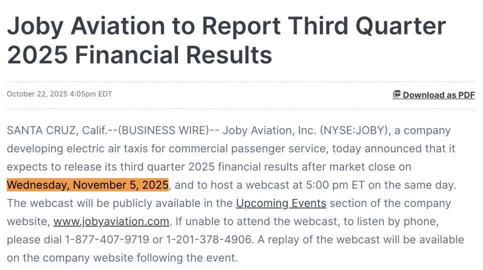 참고로 조비는 오는 11월 5일 수요일 장 마감 이후에 2025년 3분기 실적을 발표할 예정입니다. 투자자들은 이 자리에서 FAA 인증 진행 상황과 상용 서비스 일정에 대한 구체적 언급이 나올 것으로 기대하고 있습니다. 엔비디아와의 협업이 기술적 도약이라면, FAA 인증은 조비가 ‘비행 가능한 미래’를 현실로 옮길 수 있느냐를 결정짓는 마지막 관문이기 때문이죠.