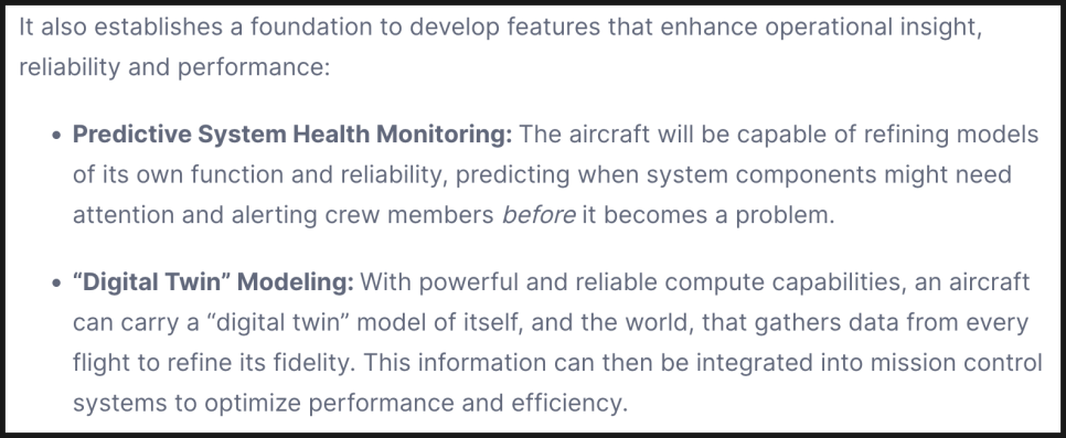 이뿐 아니라, 예측형 시스템 점검(Predictive System Health Monitoring) 기능도 탑재될 예정인데요. 항공기가 스스로 부품의 상태를 학습하고, 고장이 예상될 때 조종사에게 사전 경고를 주는 기술이라고 합니다. 또한, 항공기 내부에 ‘디지털 트윈(Digital Twin)’ 모델을 운용할 수 있게 되어, 실제 비행 중 수집한 데이터를 기반으로 시스템을 지속적으로 개선합니다. 이러한 데이터는 향후 비행 운영의 효율성과 안전성을 극대화하는 데 활용될 예정입니다.