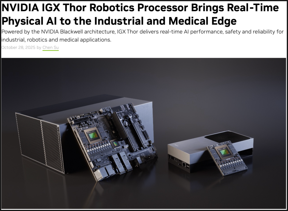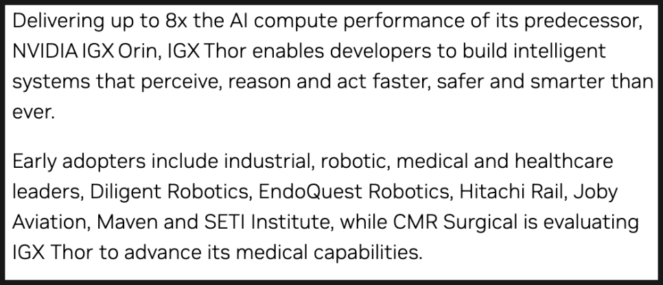 엔비디아가 새롭게 발표한 IGX Thor는 자사의 블랙웰(Blackwell) 아키텍처를 기반으로 한 산업용 AI 시스템인데, 기존 모델인 IGX 오린(IGX Orin)보다 최대 8배 빠른 AI 연산 능력을 제공한다고 합니다.