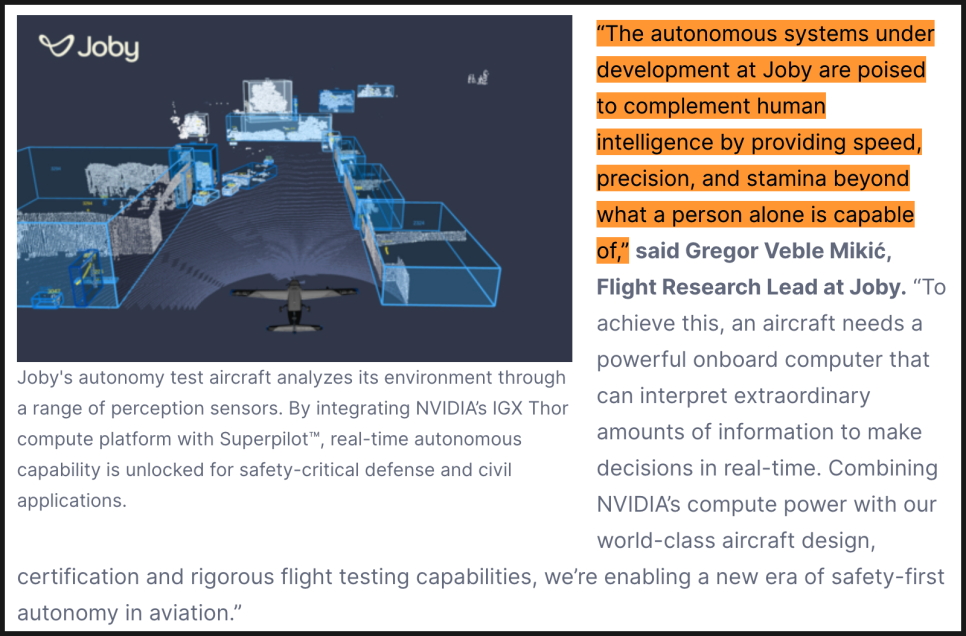 그러니까 엔비디아의 컴퓨팅 파워를 통합한 조비의 항공기는 단순히 ‘자동 운항’ 수준을 넘어, 상황 판단과 의사결정까지 수행할 수 있게 된다는 건데요.