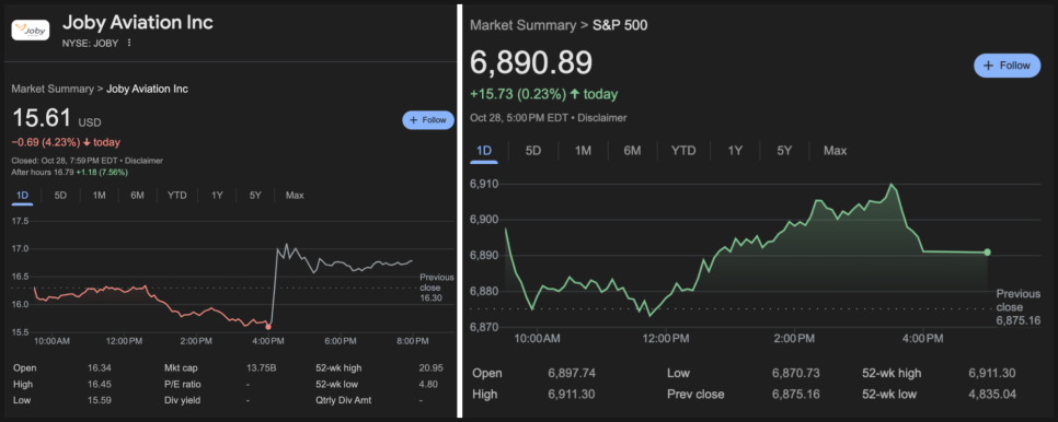 10월 28일, S&P 500이 상승 마감했음에도 조비 에비에이션 주가는 4% 하락하면서 힘이 없는 모습을 보였습니다. 시간이 지날 수록 상승한 시장과 달리 조비 주가는 점점 더 떨어지는 모습을 보였는데요. 그런데 장 마감 이후 7% 이상 급등했습니다.