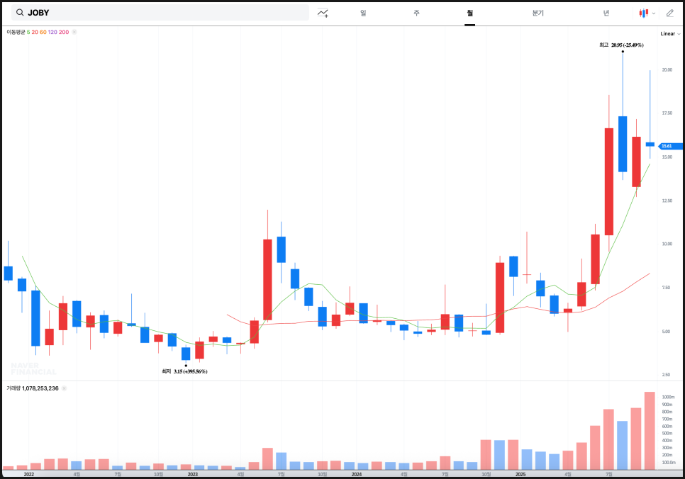 조비 주가 주봉 차트를 보면, 2025년 2분기 중반 이후부터 본격적인 상승 전환이 이뤄진 흐름이 확인됩니다. 5달러 중반대에서 장기간 박스권을 형성하다가 6월부터 거래량이 폭발적으로 증가했고, 7~8월에 걸쳐 단기간에 20달러선을 돌파했습니다. 이는 엔비디아 협업 기대감과 FAA 인증 가속화 전망이 동시에 반영된 결과로 해석됩니다.