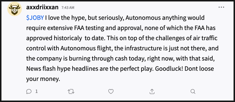 하지만 모든 투자자들이 낙관적인 건 아닙니다. 다른 사용자들은 “FAA가 아직 자율비행 시스템을 공식 승인한 사례가 없다”며, 규제 승인까지는 여전히 험난한 길이 남아있다고 경고했습니다.