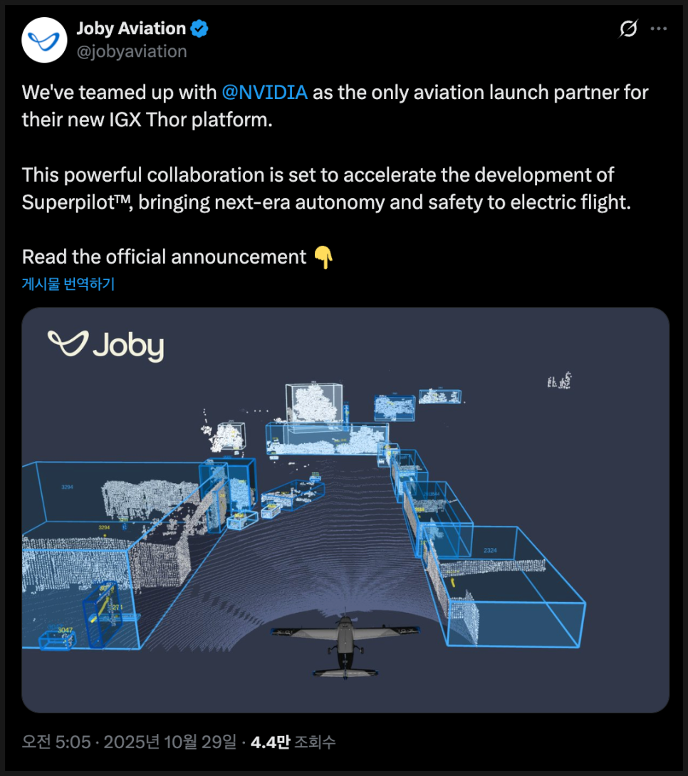 이 플랫폼은 의료 로봇, 철도, 공장 자동화, 그리고 항공 분야까지, AI가 실제 물리적 환경에서 판단하고 행동하는 ‘물리적 AI(Physical AI)’ 시대를 열기 위한 핵심 기술인데요. 조비는 이 강력한 연산 능력을 활용해 항공기 내부에서 실시간으로 환경을 인식하고, 기상·관제·긴급 상황 등 수많은 변수를 즉각적으로 처리하는 자율비행 시스템을 구현할 계획입니다.