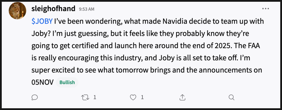 “아마도 FAA 인증과 2025년 말 상용 런칭이 가까워진 게 아닐까요? FAA가 이 산업을 적극적으로 밀어주고 있고, 조비는 이제 곧 이륙할 준비가 된 것 같습니다.”