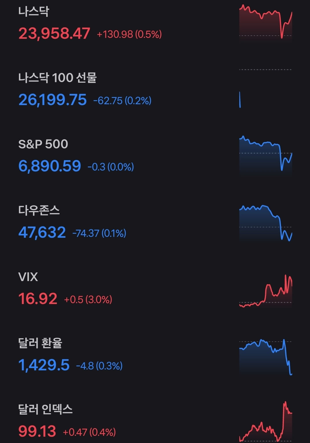 → 연준이 기준금리를 인하했지만 추가 인하 신호가 약해지며 채권금리가 반등했습니다. 다우와 S&P500은 약세로 전환했고 반면 나스닥은 AI 중심 수요가 견조해 사상 최고가를 경신했습니다.