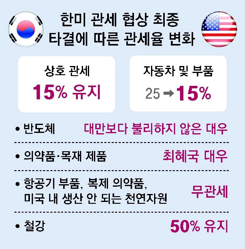 이번 합의로 미국은 자동차 관세를 일본, 유럽연합(EU)과 같은 15% 수준으로 인하하는 것은 물론 반도체는 최대 경쟁국인 대만과 대비해 불리하지 않은 수준의 관세를 적용하기로 했음