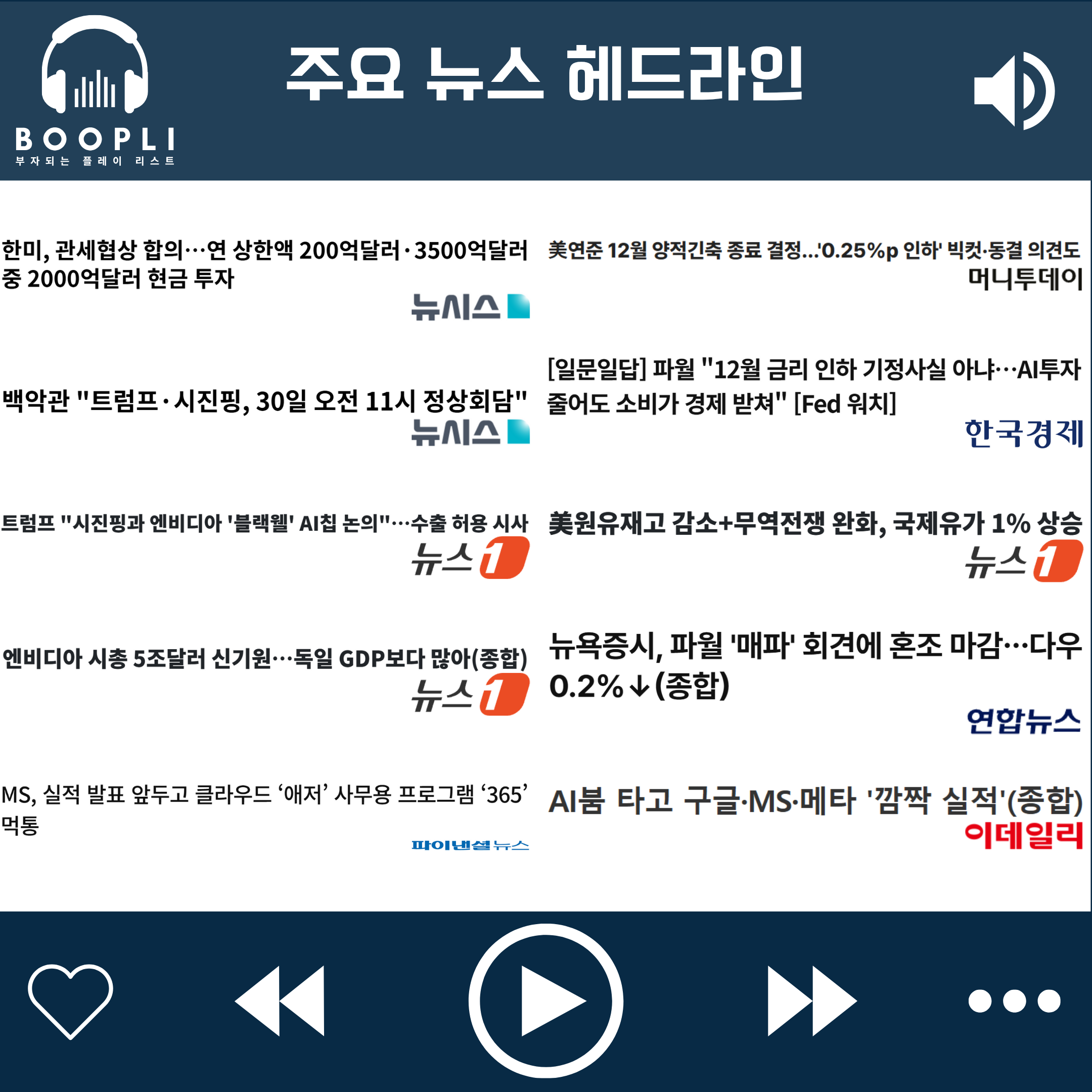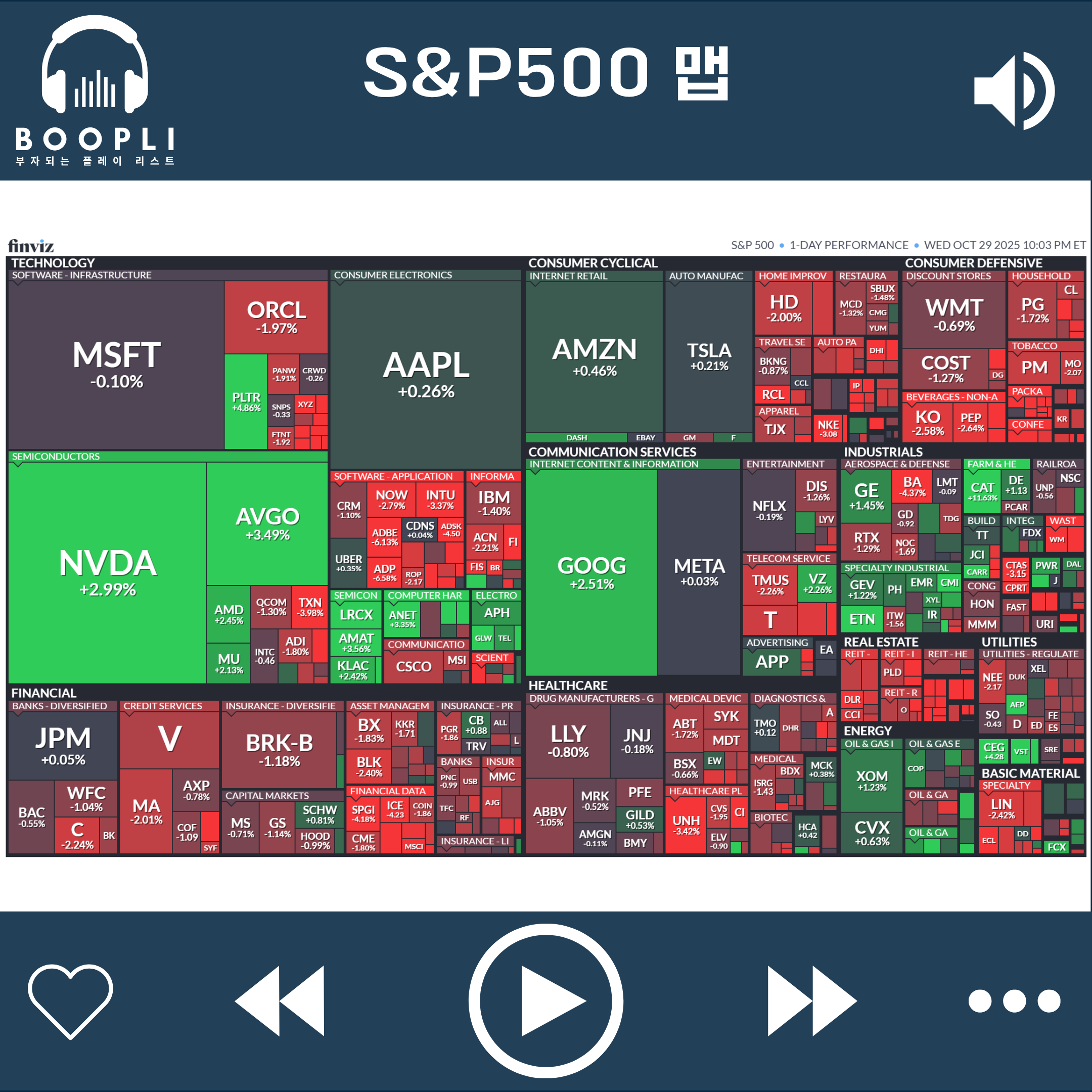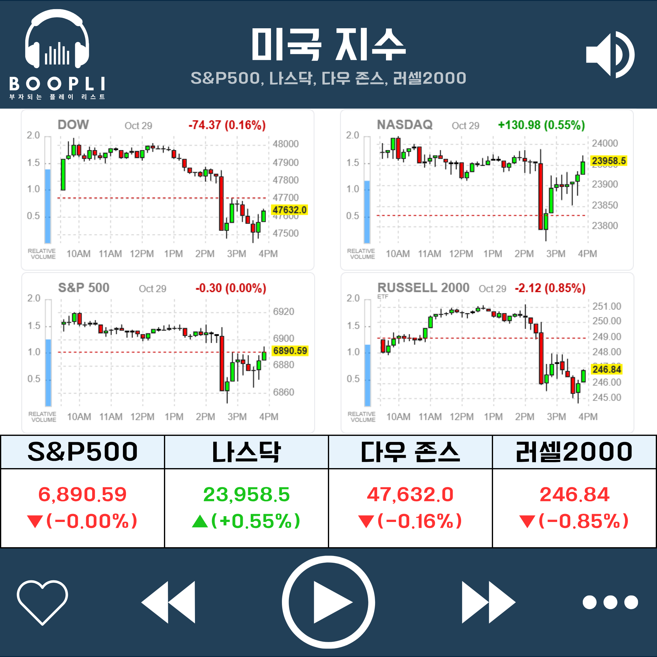 장중에는 10월 FOMC 성명서가 발표되며 연준은 정책금리를 25bp 인하하고 12/1부터 양적긴축(QT)을 종료한다고 밝혔으나, 이미 시장 예상치에 부합한 수준으로 발표 직후 지수 반응은 제한적