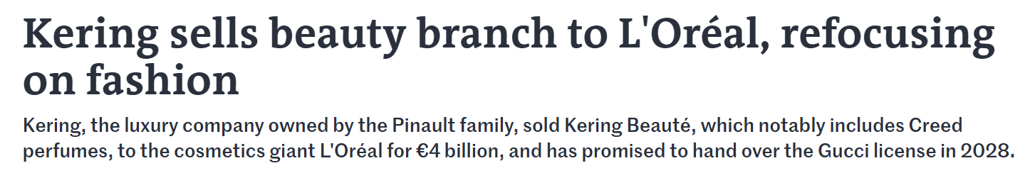 케링이 보유했던 뷰티 축은 2023년 향수 브랜드 크리드(Creed)를 인수한 뒤 ‘케링뷰티(Kering Beauté)’라는 이름으로 구축된 비교적 새로운 사업입니다. 럭셔리 브랜드가 뷰티 사업을 인하우스로 키워 나가는 흐름은 이전에도 있었지만, 케링의 시도는 그만큼 과감했고 리스크도 컸습니다. 그러나 2025년 10월 19일, 케링은 자사의 뷰티 단위를 로레알에 매각하고 50년간 자사 럭셔리 브랜드에 대한 향수·뷰티 라이선스를 로레알에 제공하기로 했다는 발표를 했습니다. 딜 규모는 약 40억 유로(46억 달러) 수준이며, 향후 양사는 웰니스와 롱제비티(지속가능한 건강) 분야에서도 합작 사업을 추진하기로 했습니다.