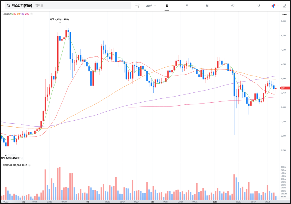 마지막으로 엑스알피(XRP, 리플)의 일봉 차트를 보겠습니다. 7월 초 247원 부근에서 상승이 시작되어 8월 초에는 4970원 고점을 기록했습니다. 하지만 이후에는 상승세가 둔화되며 점차 횡보 구간으로 진입했고, 9월 중순부터는 매도세가 강해지며 350원대까지 조정이 이어졌습니다. 최근에는 3800~4000원대에서 가격이 안정되며 단기 반등 시도 구간에 머물러 있습니다.