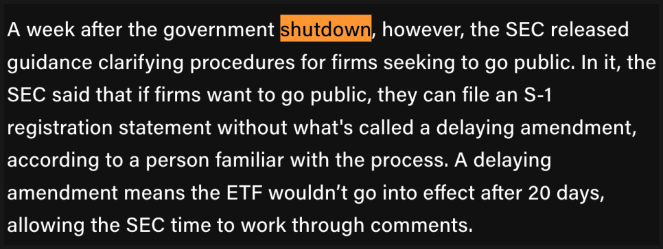 흥미로운 점은, 이러한 ETF들이 미국 정부 셧다운(업무정지) 기간 중에 승인되었다는 사실입니다. SEC(미 증권거래위원회)가 인력 부족으로 정상 운영되지 못했음에도, 새로운 절차가 도입되면서 상장 신청서(S-1)가 자동으로 효력이 발생할 수 있게 되었죠. 덕분에 비트와이즈와 그레이스케일 모두 예정대로 출시를 진행할 수 있었습니다.