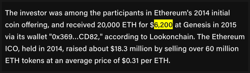 이 투자자는 2015년 제네시스 블록 시점에 2만 개의 ETH를 단 6,200달러에 구매했던 인물로, 현재 기준으로는 약 8천만 달러 상당의 자산을 보유하고 있는 셈입니다.