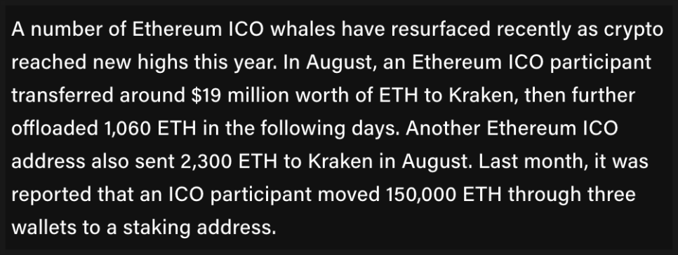 온체인(블록체인 상의) 데이터에 따르면, 2014년 이더리움 ICO에 참여했던 한 투자자가 1,500 ETH, 약 600만 달러 규모의 코인을 거래소 크라켄(Kraken)으로 이체했습니다.