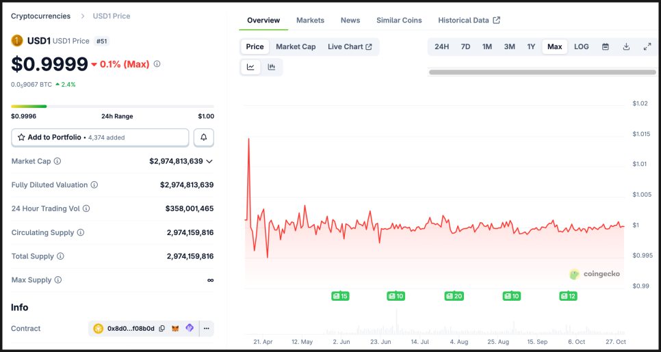 현재 USD1은 시가총액 약 30억 달러 로, 전 세계 스테이블코인 중 여섯 번째로 큽니다.