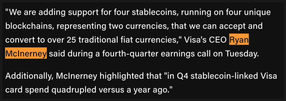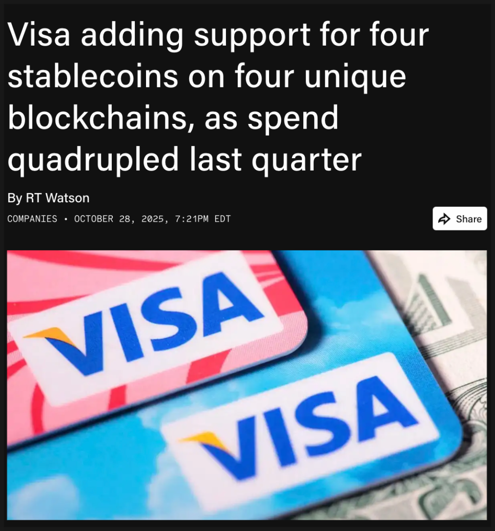 ETF만큼이나 주목할 만한 뉴스는 비자(Visa) 의 발표입니다. 비자는 이번 분기 실적 발표 자리에서, 4종의 스테이블코인을 4개의 블록체인 네트워크 위에서 지원할 예정이라고 밝혔습니다.
