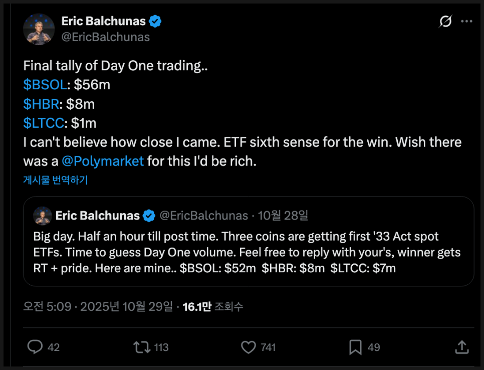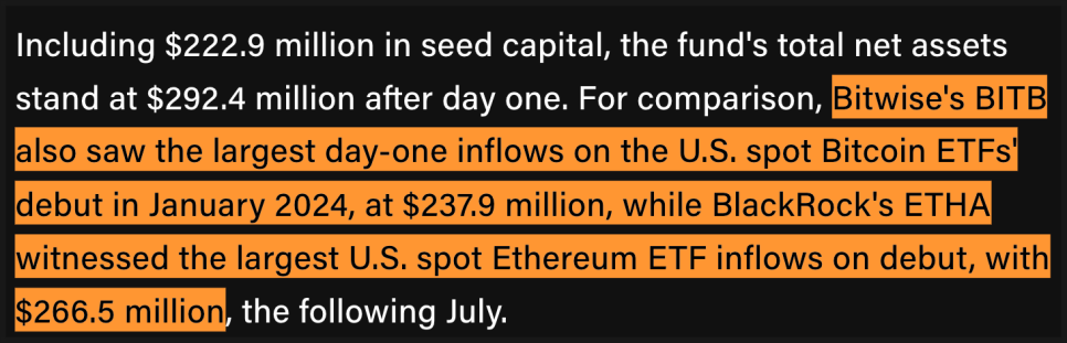 블룸버그의 에릭 발추나스(Eric Balchunas) 애널리스트는 첫 한 시간 동안 거래대금이 1,000만 달러, 하루 총 거래량은 5,790만 달러 를 기록했다고 밝혔습니다. 올해 모든 ETF 중 가장 활발한 첫날 거래량이었다는 점에서 시장의 관심이 얼마나 큰지 알 수 있습니다.