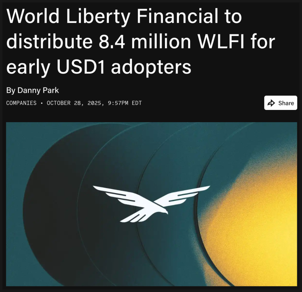 WLFI는 자체 스테이블코인인 USD1을 발행한 회사로, 최근 USD1 포인트 프로그램에 참여한 사용자들에게 WLFI 거버넌스 토큰 840만 개를 지급한다고 밝혔습니다.
