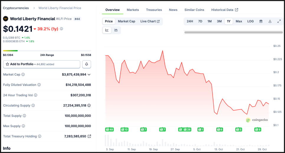 다만 WLFI 자체 토큰 가격은 하루 새 5%가 하락해 0.14달러를 기록했습니다. 이는 여전히 암호화폐 프로젝트가 시장 변동성의 영향을 크게 받는다는 점을 보여줍니다.