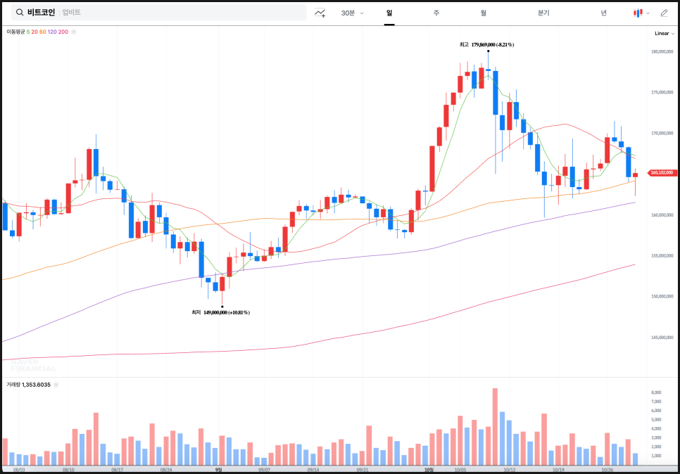 우선 9월 초 저점은 약 1억 4900만 원대였는데요. 이후 꾸준한 반등세를 보이며 10월 중순에는 최고 1,798만 원까지 상승했습니다. 단기간에 20% 가까운 상승이 나온 셈이죠. 하지만 그 직후부터는 고점 부근에서 매도세가 강하게 출현하면서, 현재는 1억 6500만 원선 근처로 되돌림이 진행 중입니다.