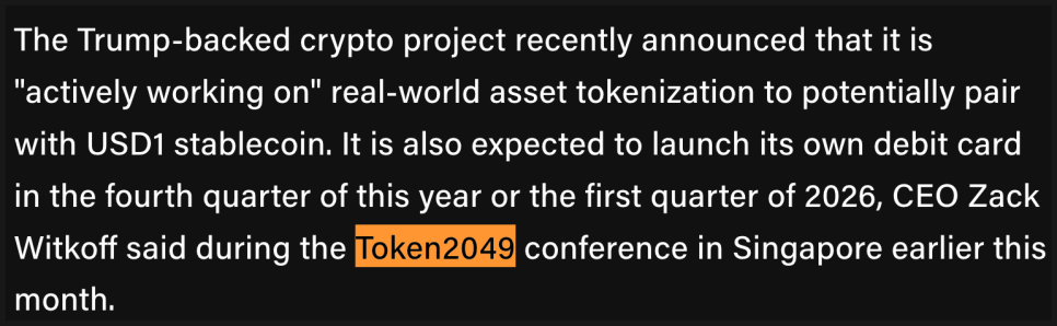 WLFI의 CEO 잭 위트코프(Zack Witkoff)는 최근 싱가포르에서 열린 ‘토큰2049(Token2049)’ 행사에서, USD1을 단순 결제용 스테이블코인으로 그치지 않고, 현실 자산(부동산, 금 등)을 토큰화해 연동하는 프로젝트로 확장할 계획이라고 밝혔습니다.