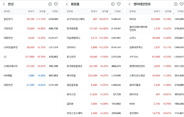 <전선 화장품 엔터 관련주 강세>