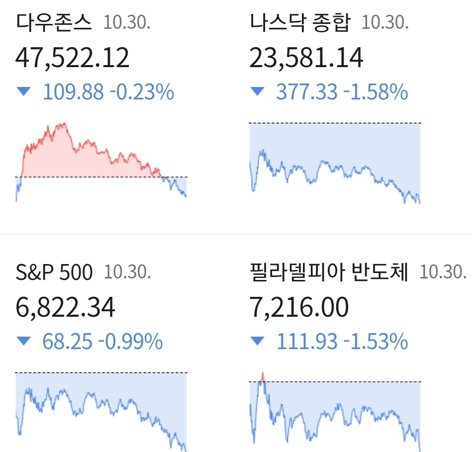 다우지수는 전일 대비 -0.23% 하락한 47.522.12에 거래를 마쳤으며, 대형주 중심의 S&P500 지수는 전장 대비 -0.99% 떨어진 6,822.34에 장을 마감하였습니다. 기술주 중심의 나스닥 지수는 전 거래일 대비 -1.58% 하락한 23.581.14에 거래를 마치며 장을 마감하였습니다.