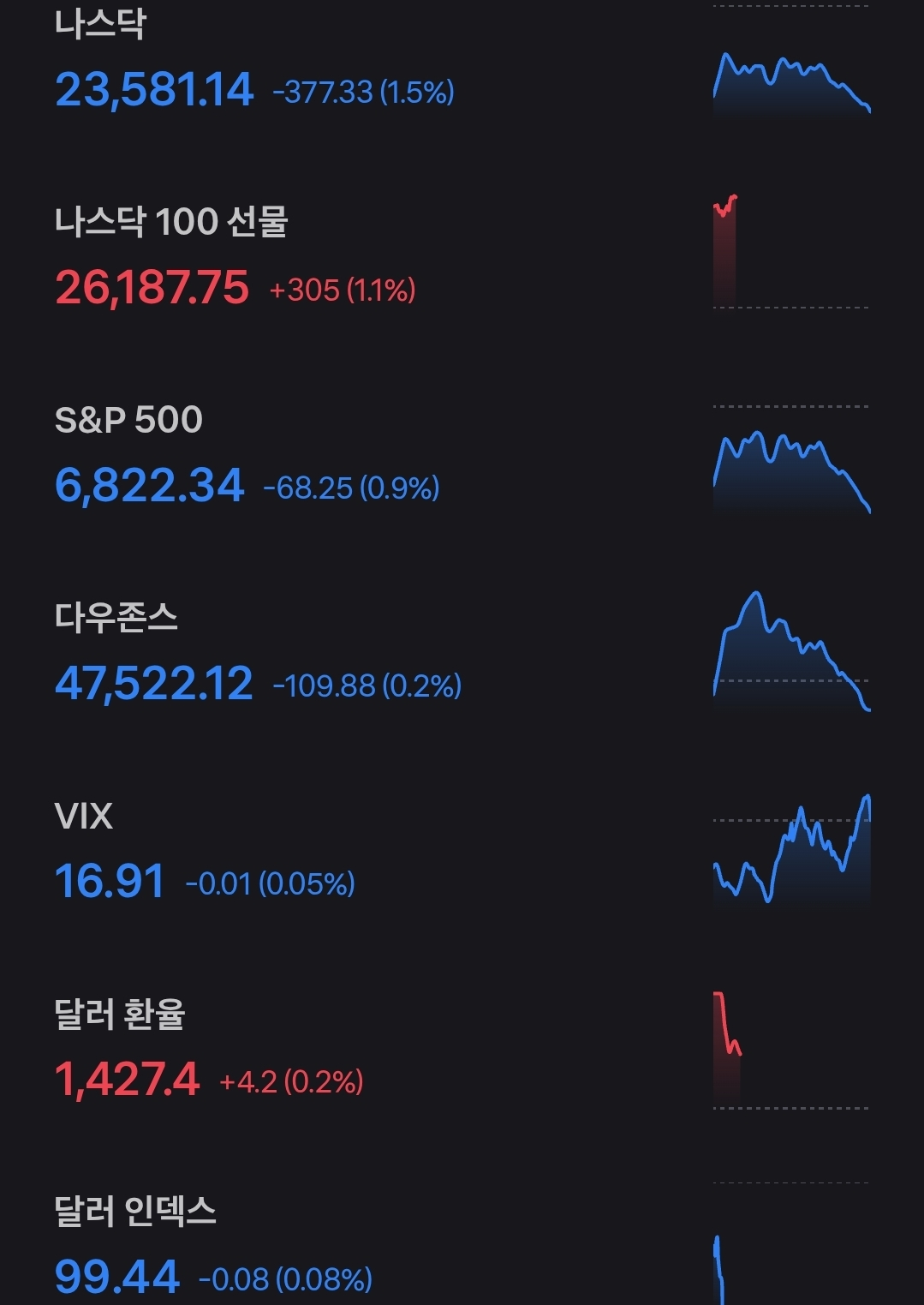 | 나스닥 | 23,581.14 / -377.33(-1.5%) |