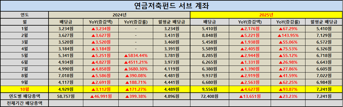 서브 계좌 또한 9,556원을 기록하며 전년 대비 무려 93.87% 증가했습니다. 두 계좌를 합산하면 연금저축펀드 전체 배당은 24,842원으로 매달 일정한 수익이 쌓여가며 안정적인 포트폴리오의 중심 역할을 하고 있습니다. 금리 변동이나 환율 리스크에 흔들리지 않고 지속적으로 자산이 불어나는 모습을 확인할 수 있었습니다.