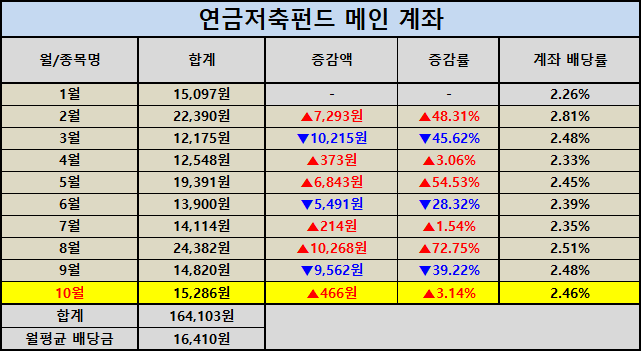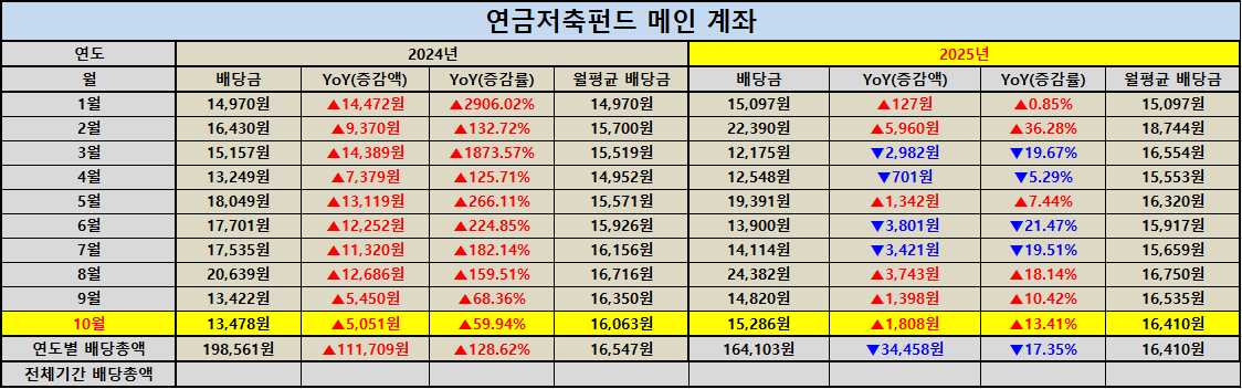 연금저축펀드 메인 계좌는 10월 배당금 15,286원으로 전년 대비 13.41% 증가했습니다. 큰 폭의 상승은 아니지만 이런 꾸준한 상승세가 장기 투자에서 가장 든든한 성장의 기반이 됩니다. 올해 누적 배당금은 164,103원, 월평균은 16,410원으로 일정한 리듬을 유지하고 있습니다. 장기 복리의 핵심은 이런 꾸준함에 있죠.