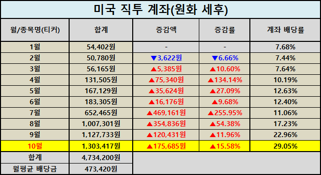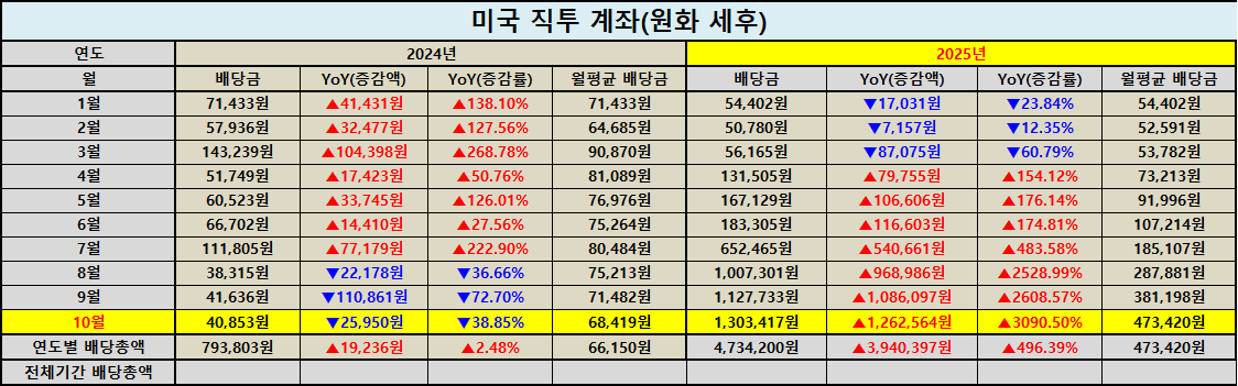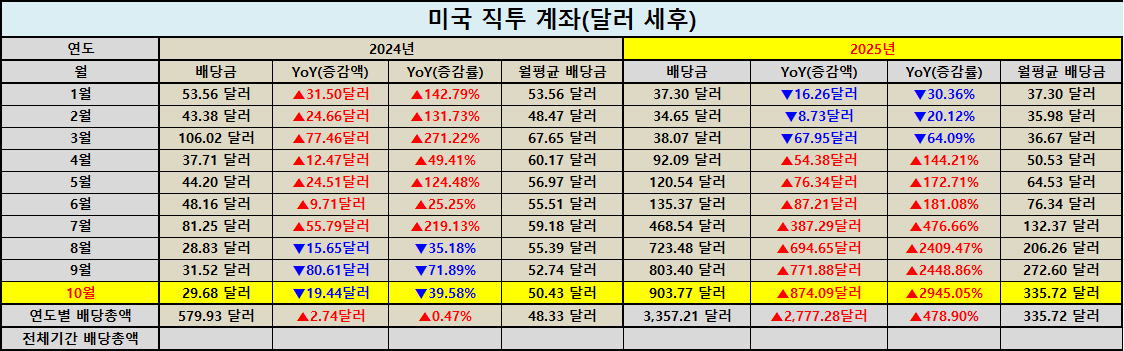 이번 달 가장 두드러진 변화는 미국 주식 직투 계좌였습니다. 10월 배당금이 원화 기준 1,303,417원으로 전년 동월 대비 3090.50% 증가했습니다. 달러 기준으로도 903.77달러를 기록하며 전년 대비 2945.05% 급등했습니다.