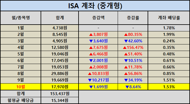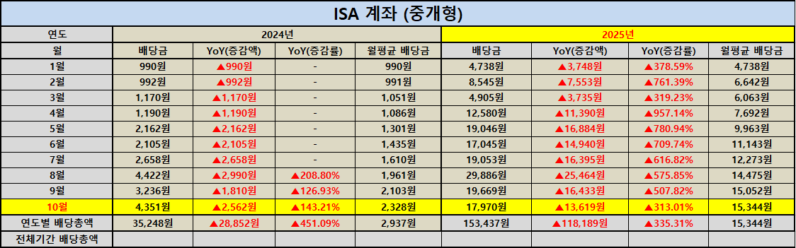 ISA는 단기적인 수익보다는 장기 자산 형성과 안정성을 중시하는 계좌이기에 올해의 꾸준한 배당 상승은 앞으로의 자산 성장 여력을 보여주는 긍정적인 신호라고 생각합니다.