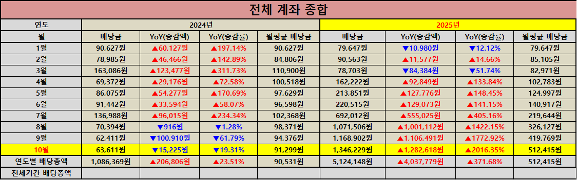 10월 배당금 합산이 1,346,229원을 기록하며 올해 누적 배당금이 512만 원을 넘어섰습니다. 매달 차곡차곡 쌓인 배당이 복리로 이어지는 모습을 보며 장기투자의 의미를 다시금 되새기게 되네요. 이번 포스팅에서는 계좌별 배당 흐름과 성장의 배경을 함께 살펴보았습니다.