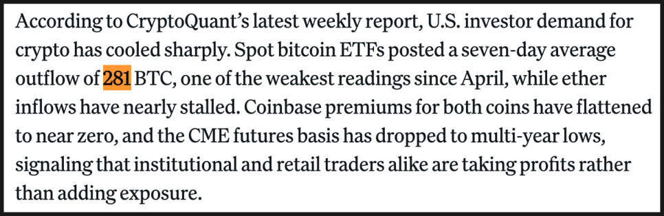 지난 일주일 동안 현물 비트코인 ETF에서는 하루 평균 281 BTC가 빠져나갔는데요. 이는 4월 이후 가장 약한 수치로, 신규 자금 유입이 멈춘 수준입니다. 이더리움(ETH) ETF로의 자금 유입도 사실상 멈춰섰습니다.
