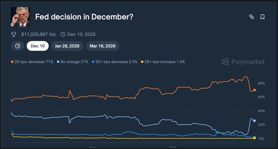 정치예측시장 플랫폼 폴리마켓(Polymarket)에 따르면, 12월 연준 회의에서 0.25%포인트(25bp) 금리 인하가 단행될 확률은 90%에서 71%로 급락했습니다. 반대로 금리 동결 가능성은 26%까지 뛰었습니다.