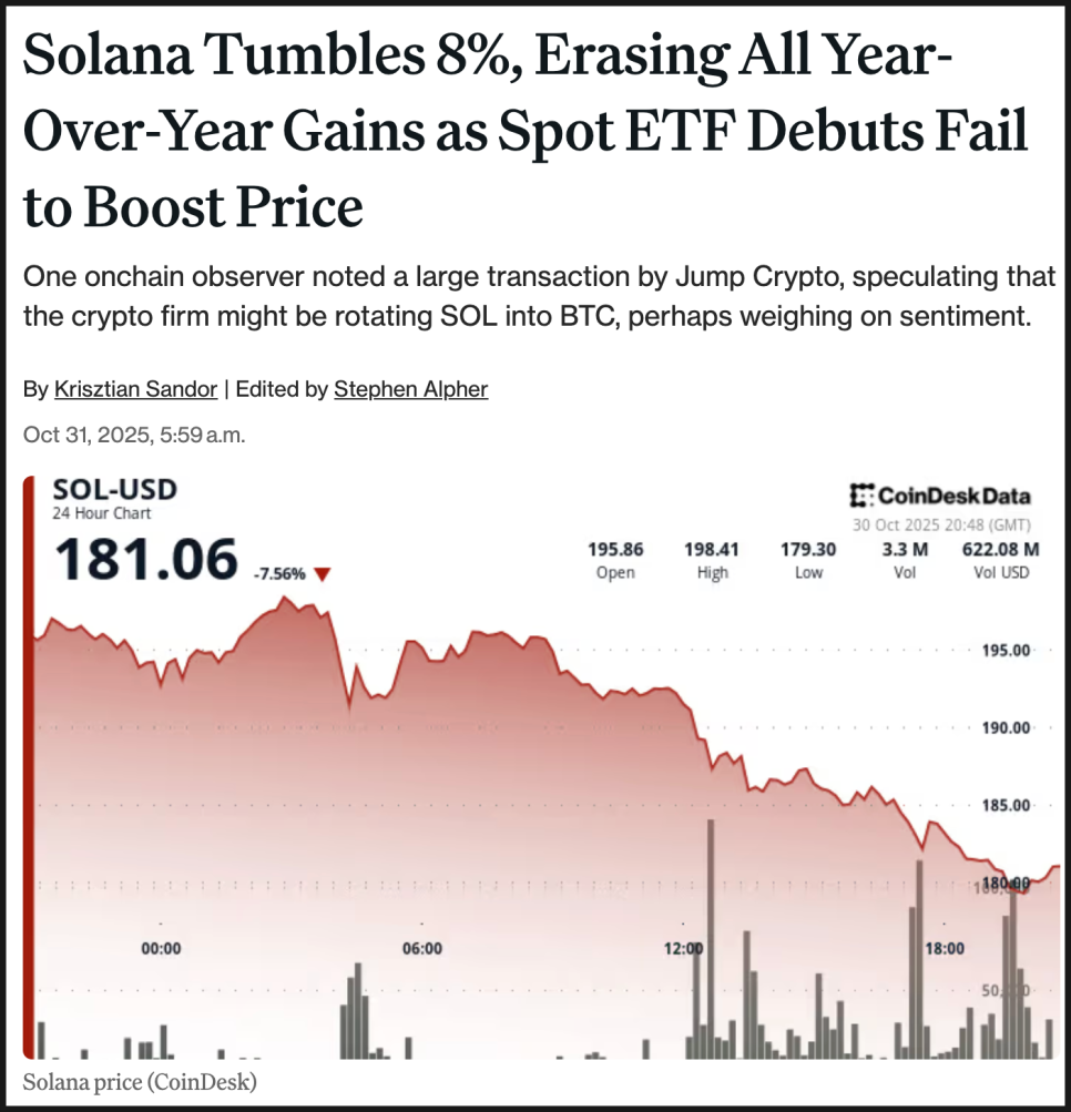 한편, 알트코인 시장의 대표주자인 솔라나(Solana)도 하락세를 피하지 못했습니다. 미국에서 처음으로 현물 솔라나 ETF가 출시되면서 ‘새로운 기관 수요’에 대한 기대가 높았지만, 정작 가격은 8% 급락해 186달러까지 떨어졌습니다.