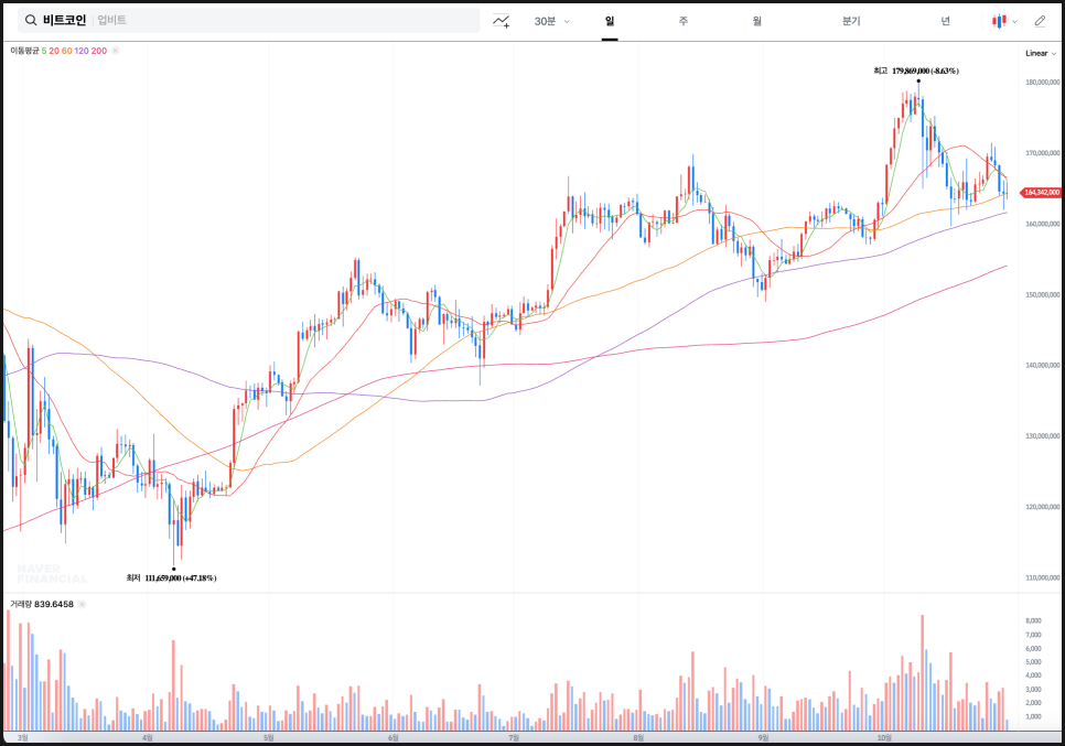 현재 비트코인 일봉 차트를 보면, 올해 4월 약 1억 1천만 원 수준에서 출발했던 비트코인은 여름까지 꾸준히 상승을 이어가며 1억 7천 9백만 원대까지 올랐지만, 이후 거래량이 줄고 이동평균선이 겹치기 시작하면서 매수세가 힘을 잃었습니다. 지금은 약 1억 4천 6백만 원대에 머물러 있으며, 단기적으로는 하락 압력이 뚜렷하게 나타나고 있습니다.